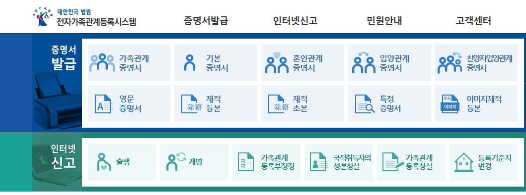 대법원 전자가족관계등록시스템 홈페이지에 접속하여 공동인증서, 카카오톡, PASS 등 간편인증 중 하나를 선택해 로그인합니다. 본인 확인이 완료되면 '증명서 발급' 메뉴로 이동합니다.